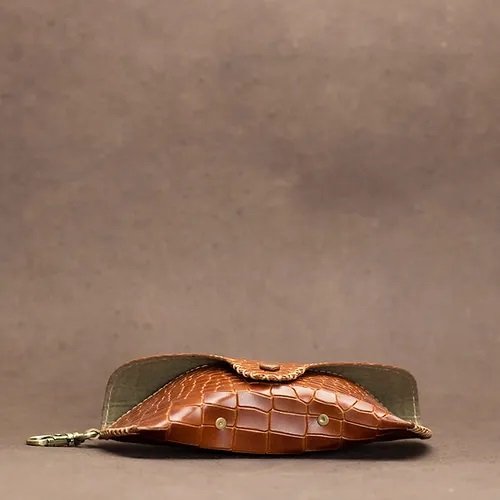 The tangy tan colored sunglass case is a stylish accessory designed to keep your sunglasses safe and secure. The case is made from high-quality genuine leather, which ensures durability and longevity. The mamba snake skin textured design adds a unique touch to the case's appearance and makes it stand out from other sunglass cases.