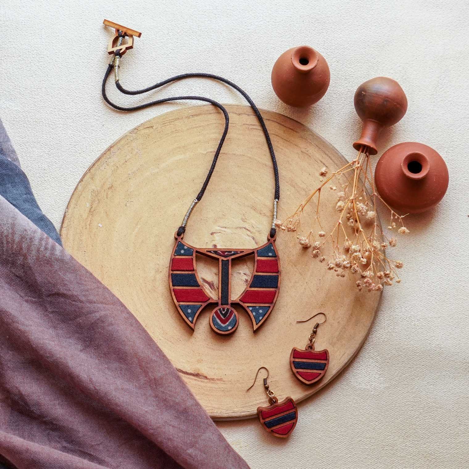 The Jewellery designs are inspired by Navajo Paintings – a form of art from American-Indians that is known for the use of prominent motifs and symbols along with vibrant colours. The necklace is made of wood and cloth; which makes it extremely light in weight, unlike metal. Besides its visual appeal, the jewellery has a powerful ethnic touch and an appealing vibe. Each piece is handcrafted with love and care and is sure to invite admiration and compliments for you. These pieces of jewellery can be teamed up with both Indian and Western outfits, to accentuate your looks