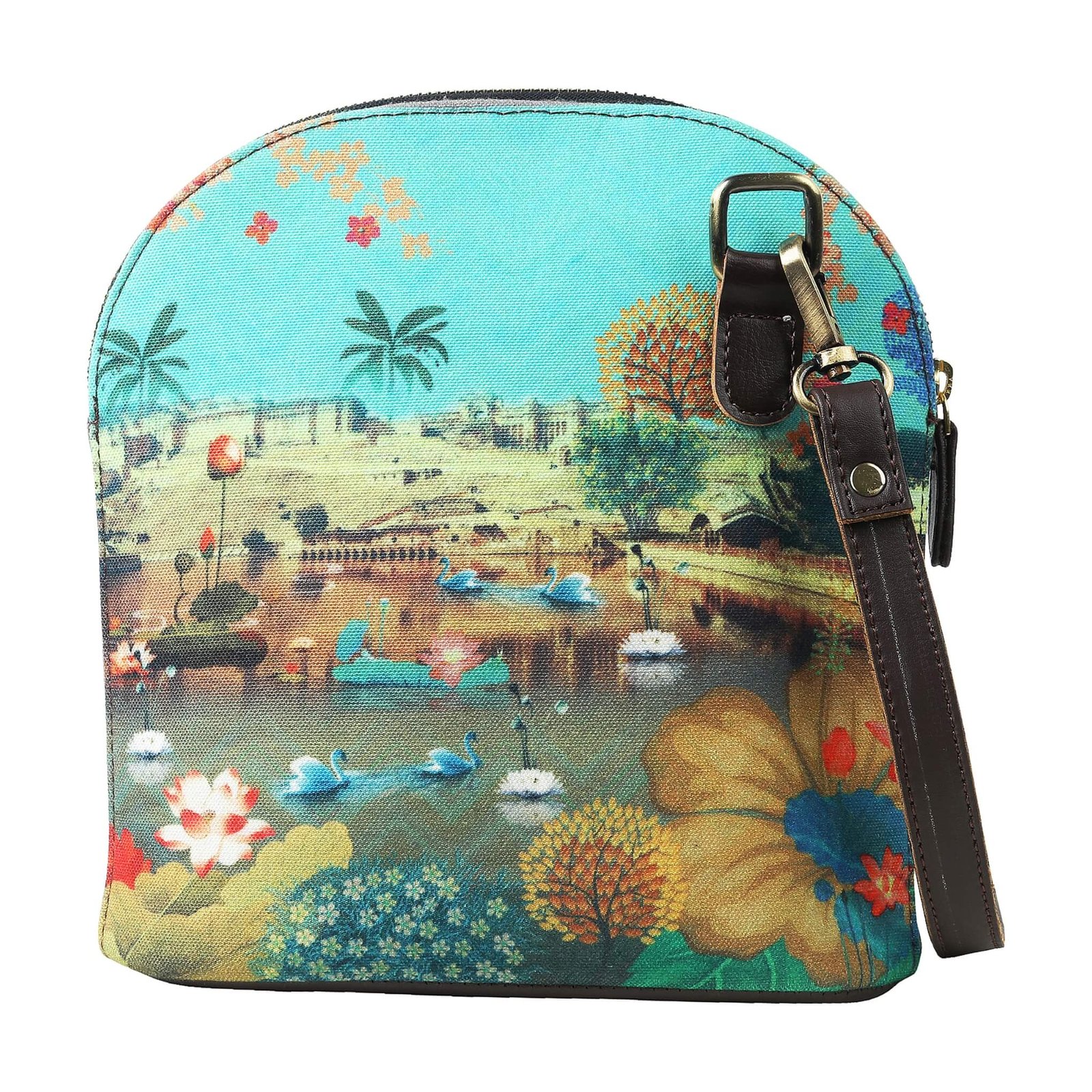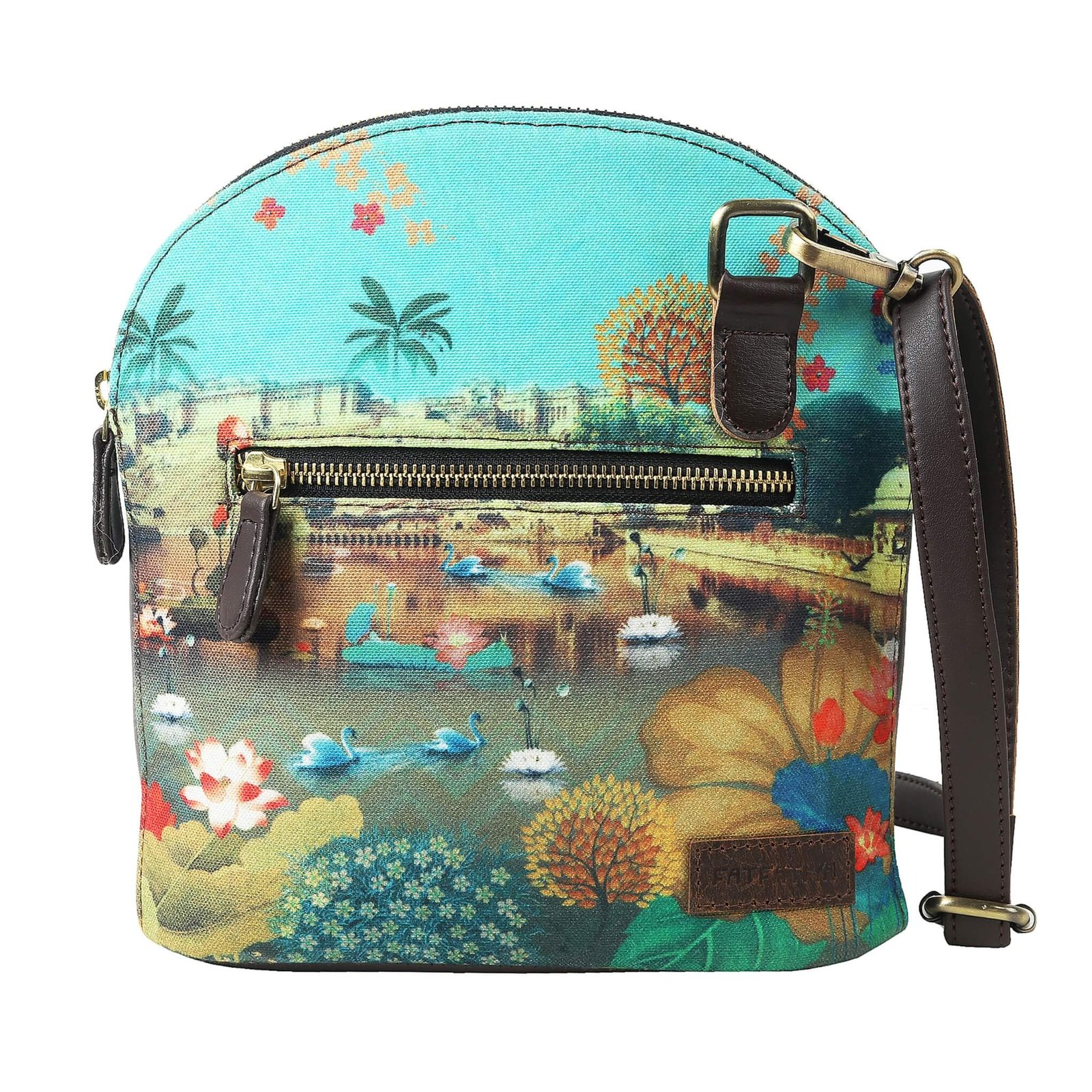 Size: 9.5 x 9 x 3 Inches Material: Poly Canvas & Vegan Leather PRODUCT FEATURES Detachable & Adjustable Sling Strap 1 Main Compartment with YKK Zipper 1 External Pocket with YKK Zipper 1 Inner Zip Pocket and 1 mobile Pocket