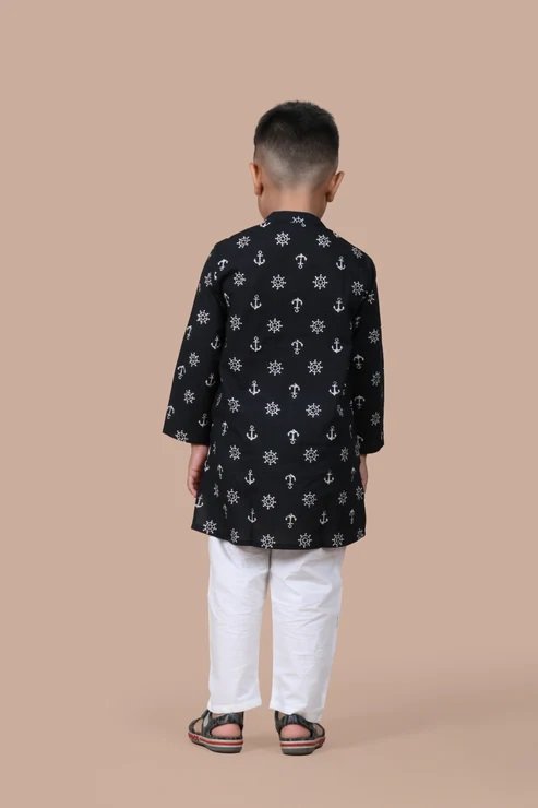 Black Anchor Kurta Pajama Set of 2 Showcasing this long kurta for your little prince is made from finest cotton. This Kurta is Hand Block Printed and has Mandarin collar. It Has full sleeves and a side pocket. It comes with White Pajamas. Its Loose fit for your baby’s comfort, since its cotton and has zero elasticity. The Set includes one kurta and one pajama. Mandarin collar Neck with half button placket. Side pocket Full sleeves Side slits Pajamas Full length Regular fit Elasticated waistband to ensure maximum comfort.
