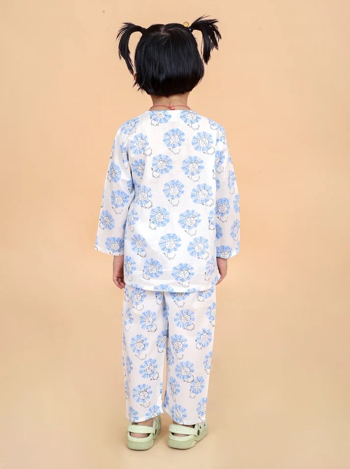 Blue Lion Night Suit Size Available 0 to 8 Years Our soft and comfortable pure cotton Hand Block Printed Night suits are so easy that they ensure that your child gets a good night sleep. These fun prints are a blast across all ages. Its Loose fit for your baby’s comfort, since its cotton and has zero elasticity. The Set includes one night shirt and pajama. Round Neck with half button placket. Full sleeves Side slits Pajamas Full length Loose fit Elasticated waistband to ensure maximum comfort.