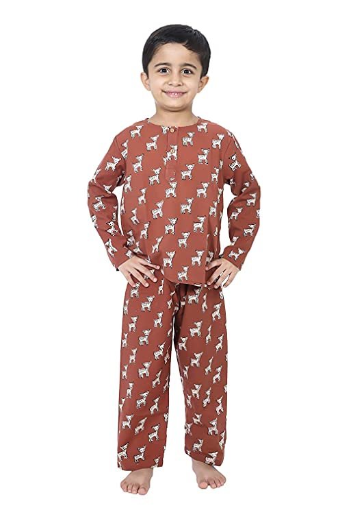 Brown Deer Print Night Suit Sizre Available 0 to 8 Years Our soft and comfortable pure cotton Hand Block Printed Night suits are so easy that they ensure that your child gets a good night sleep. These fun prints are a blast across all ages. Its Loose fit for your baby’s comfort, since its cotton and has zero elasticity. The Set includes one night shirt and pajama. Round Neck with half button placket. Full sleeves Side slits Pajamas Full length Loose fit Elasticated waistband to ensure maximum comfort.