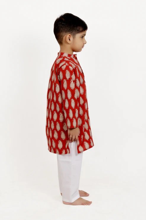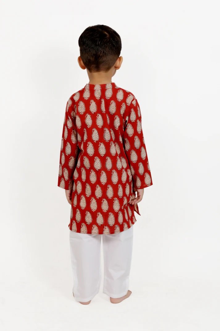 Brown Paisley Block Printed Kurta Pajama Set of 2 Showcasing this long kurta for your little prince is made from finest cotton. This Kurta is Hand Block Printed and has Mandarin collar. It Has full sleeves and a side pocket. It comes with White Pajamas. Its Loose fit for your baby’s comfort, since its cotton and has zero elasticity. The Set includes one kurta and one pajama. Mandarin collar Neck with half button placket. Side pocket Full sleeves Side slits Pajamas Full length Regular fit Elasticated waistband to ensure maximum comfort.
