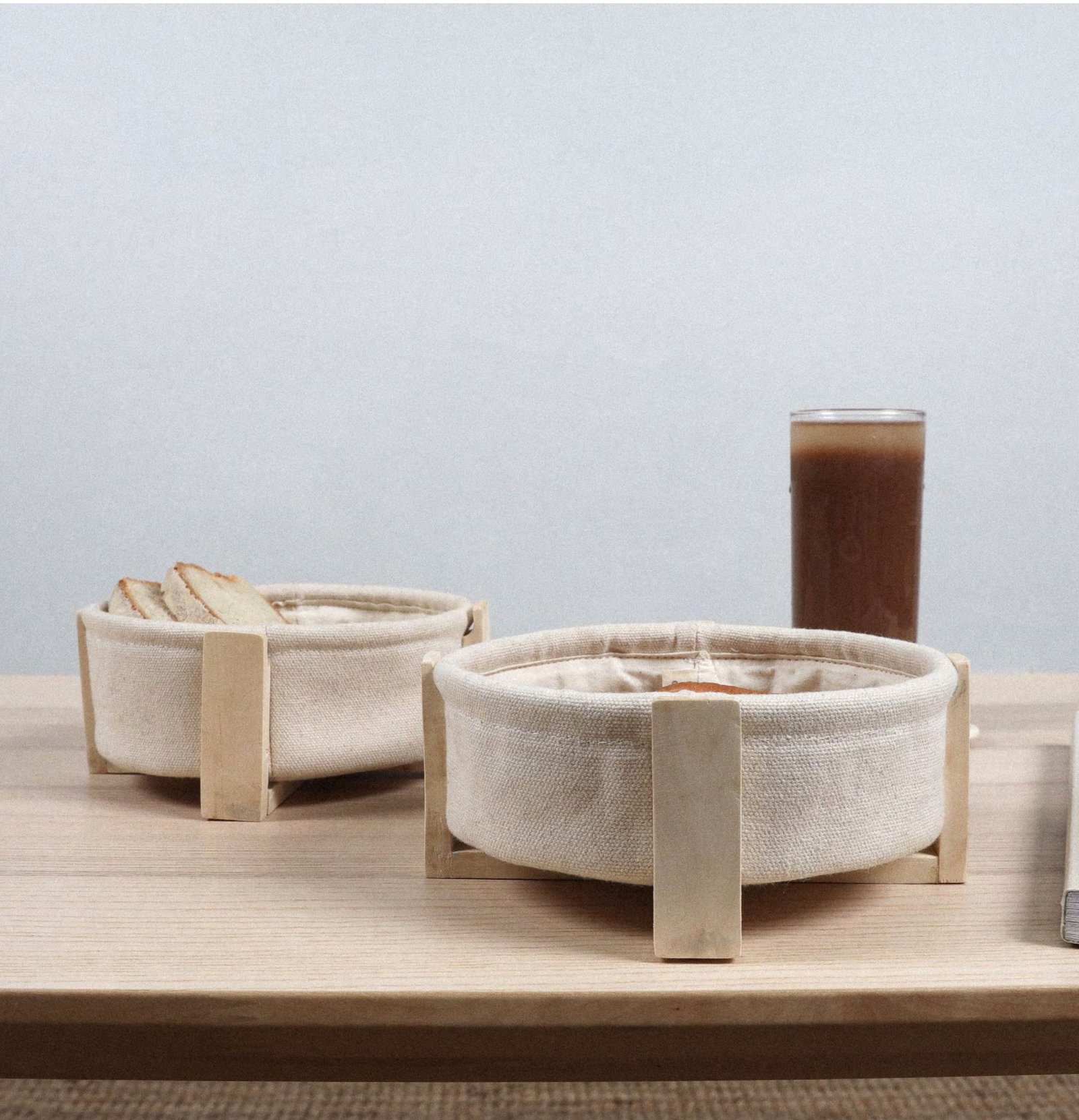 Circle Bread Basket with wooden stand One of a kind bread baskets designed with a sturdy canvas basket and supporting wooden stand which is detachable if required. Size: D14cm x H5cm Material/ Fabric: Canvas &wood Colour:Off-white MRP: Rs. 450