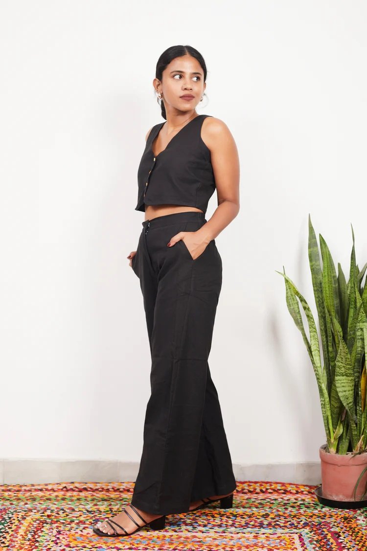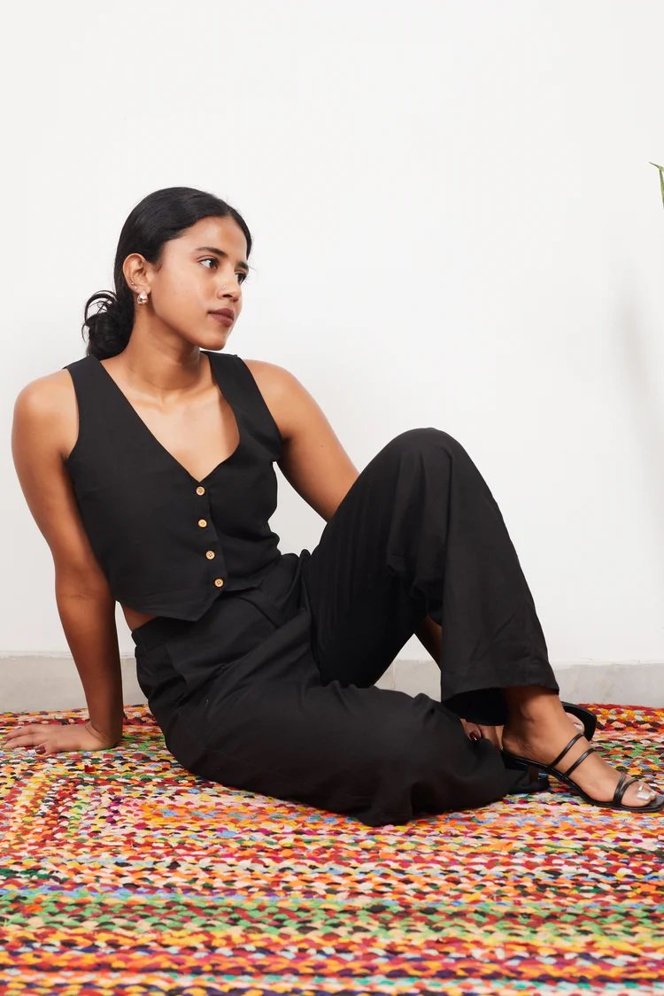 Design: • Is made of pure ikat handloom cotton. • The vest has functional buttons and comes with an attached lining • Super comfortable cotton pants with pockets and elastic at the back • Margins inside for easy alteration Size and fit: The model (5'4") is wearing a size S Disclaimer: Due to the differences in displays of computers / laptops / phones, the colors on the product you receive may vary marginally from the colors seen on our website website Material & Care: This is a handcrafted product and may bleed in the initial few washes 100% cotton Hand-wash cold, wash dark colours separately.