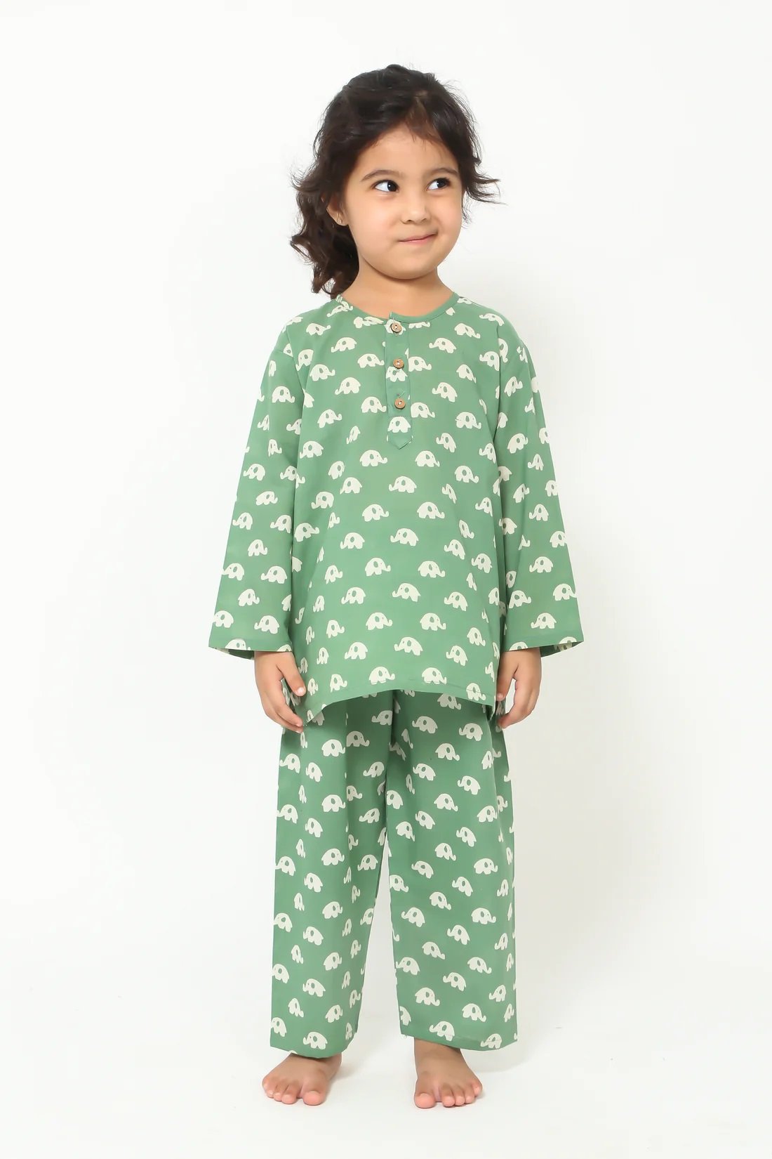 Green Elephant Night suit Unisex Sizes Available 0 to 8 Years -- Our soft and comfortable pure cotton Hand Block Printed Night suits are so easy that they ensure that your child gets a good night sleep. These fun prints are a blast across all ages. Its Loose fit for your baby’s comfort, since its cotton and has zero elasticity. The Set includes one night shirt and pajama. Round Neck with half button placket. Full sleeves Side slits Pajamas Full length Loose fit Elasticated waistband to ensure maximum comfort.