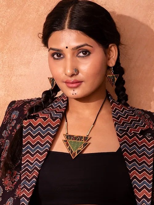 Green Upcycled Fabric and Repurposed Wood Triangular Earrings