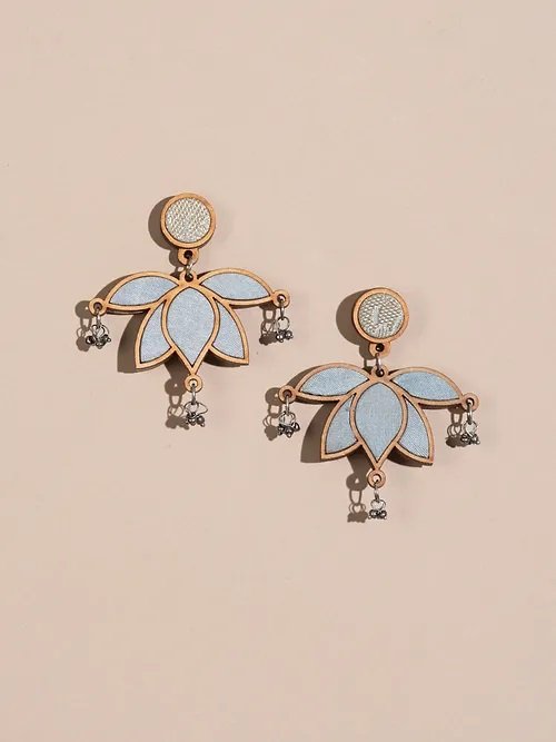 Grey Gold Lotus Upcycled Fabric and Repurposed Wood Statement Earrings