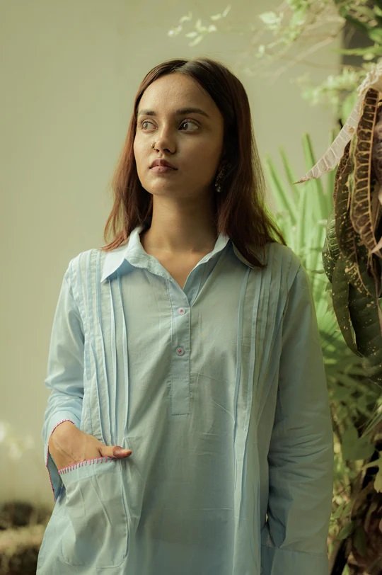 GULBAHAR - Sky Blue Kurta This kurta is made from soft cotton and detailed with exquisite blanket stitching done by hand. It's the perfect blend of comfort and style for the summer. Color: Sky Blue Fabric: 100% cotton Sleeve Length: Full CARE INSTRUCTIONS: DRY CLEAN ONLY