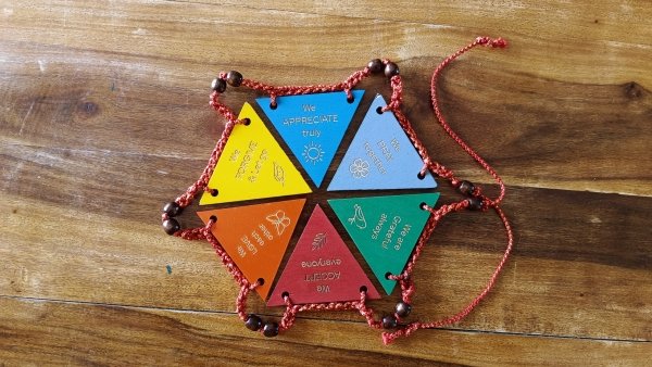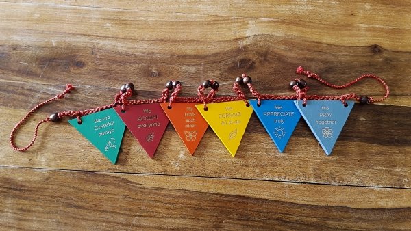 ‘Toran’ is a Devanagari word that means ‘Dangler’ or ‘Hanging’. This wooden Toran brings to you some essential virtues that spread an essence of happiness in the family. These are – Appreciation, Gratitude, Love, Prayer, Forgiveness & Acceptance. These virtues are carved on both sides of each wooden triangular piece of the toran in languages – Hindi & English on respective sides. These are – Appreciation, Gratitude, Love, Prayer, Forgiveness and Acceptance. How to use: Hang the Toran anywhere prominently visible at your home, preferably at the door frame. Choose one or more of the 6 virtues that you would like to consciously practice with your family members every day. For example, ‘We are GRATEFUL always’.