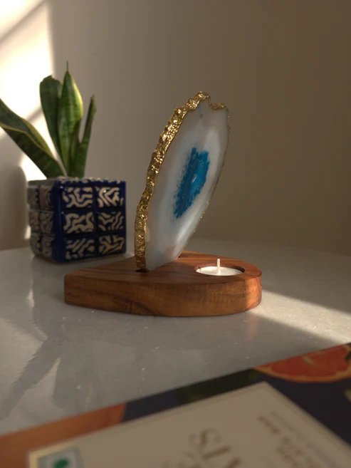 Immerse yourself in the timeless elegance of our Turquoise Agate Desk Clock, a symbol of purity, clarity, and new beginnings that seamlessly blends with any interior style. Beyond its aesthetic appeal, this shelf clock embodies incredible benefits that enhance both your space and well-being. Stone/Material: Agate Color: Turquoise Surface Texture: Natural Dimensions: 5.5"x5"x5" Key Features: Healing Energy: Crafted from agate renowned for its grounding and stabilizing properties, our Agate Table Clock radiates soothing and calming energy. It creates a peaceful atmosphere in your home or office, reducing stress, promoting relaxation, and enhancing overall well-being. Natural Beauty: Each clock is a unique work of art, showcasing the natural beauty of agate slices. The intricate patterns and rich colors of agate add elegance and sophistication to any room, becoming eye-catching focal points that enhance your space's aesthetic appeal. Time Management: Our Turquoise Agate Table Clocks not only adorn your space but also serve as reliable timekeeping devices. With precise quartz movements, they keep you on schedule and help manage your time effectively, combining style and utility seamlessly. Vastu Enhancement: In Vastu Shastra, agate is believed to bring positive energy and balance to the environment. Placing an Agate Table Clock in specific areas of your home or office harmonizes energy flow, promoting harmony, prosperity, and success, making it an excellent choice for creating a Vastu-compliant space. Embrace simplicity, beauty, and functionality with our Turquoise Agate Table Clock, and experience the transformative power of agate in your space and life. Color and size of the item may differ from the picture shown above due to photography conditions.
