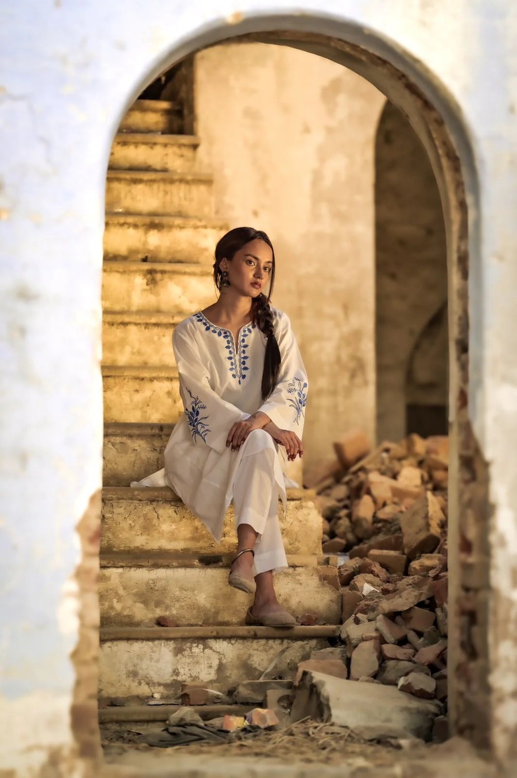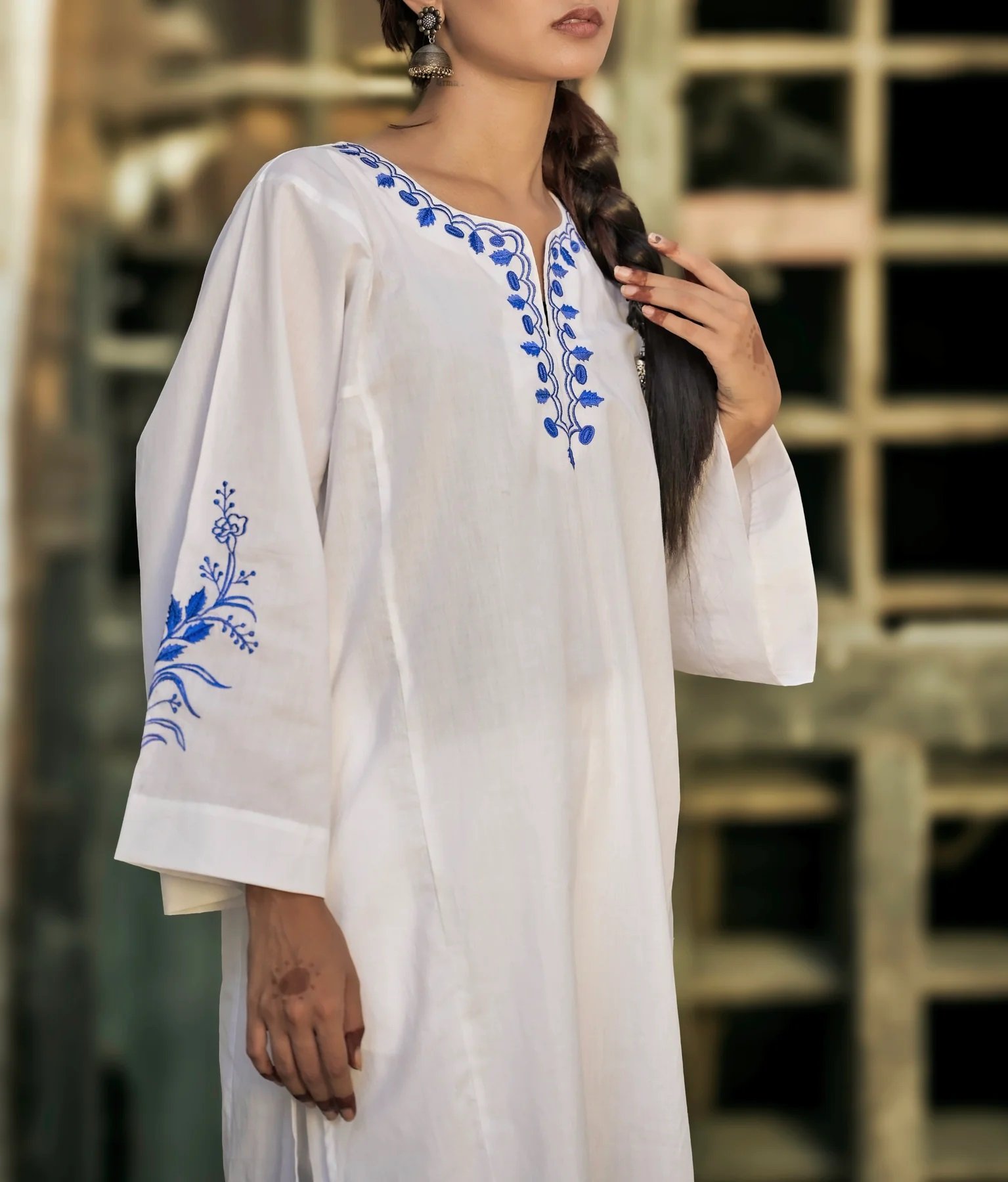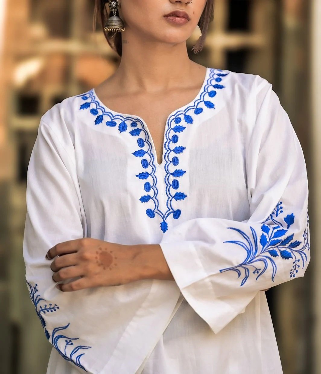 NEELGAGAN Kurta: Our BESTSELLER embraces timeless elegance with our 100% pure cotton ensemble, featuring intricate blue machine embroidery on a pristine white canvas. Color: White Fabric: 100% cotton Sleeve Length: Elbow CARE INSTRUCTIONS: DRY CLEAN ONLY