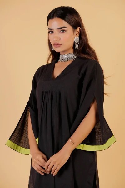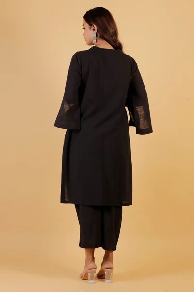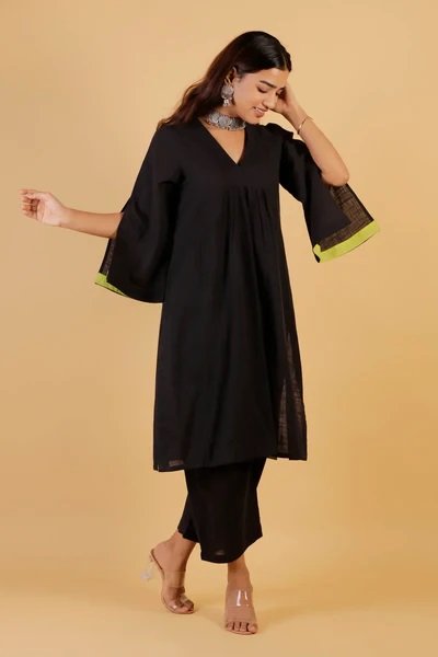 Pretty & Refreshing Cotton Slub Co-ord Set.kurta With Pintucks On the Neck & Centre Front. 3/4th Sleeves With Contrast Colour Facing On Sleeves & Side Slits.short Palazzo With Elasticated Waist. can Be Worn On A Casual, semi Formal & Formal Occasion. FABRIC - 100% Cotton Slub CARE - Hand Wash Separately In Cold Water. Dry Reverse In Shade.