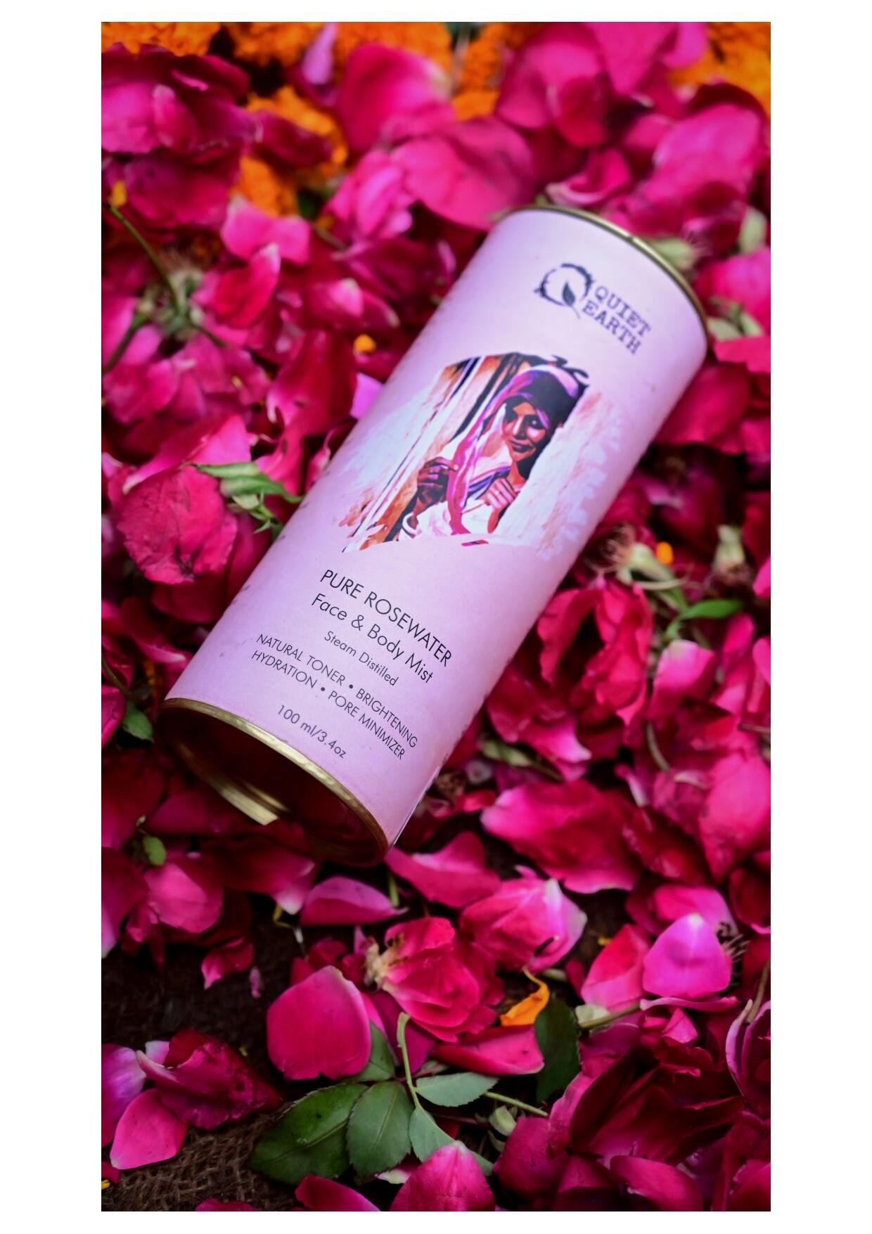 Quiet Earth Pure Rose Water is a hydrating skin elixir made from farm fresh roses from the famous rose city Pushkar. TONER| Brightens| Hydrates | Minimizes Pores Benefits: A powerhouse of anti-oxidants: Neutralizes free radicals & provides anti-ageing benefits. Antibacterial properties: Prevents acne, clarifies and brightens skin tone by cleansing & unclogging pores. Heals, Hydrates & nourishes skin while protecting its moisture barrier. Balances skin pH levels and tightens & minimizes pores. Soothes redness. Beneficial in skin conditions like rosacea, eczema, etc. Mood Booster: Proven to provide relief from symptoms of depression.