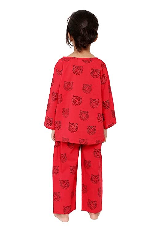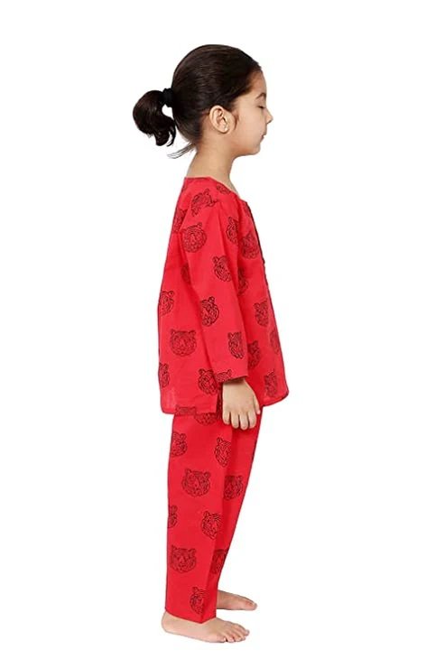 Red Black Loin Night Suit Size Available 0 to 8 Years Our soft and comfortable pure cotton Hand Block Printed Night suits are so easy that they ensure that your child gets a good night sleep. These fun prints are a blast across all ages. Its Loose fit for your baby’s comfort, since its cotton and has zero elasticity. The Set includes one night shirt and pajama. Round Neck with half button placket. Full sleeves Side slits Pajamas Full length Loose fit Elasticated waistband to ensure maximum comfort.
