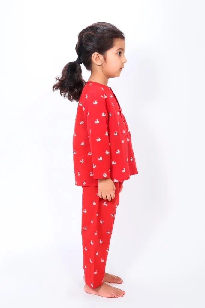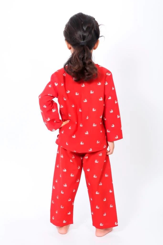 Red Whale Print Night Suit Sizre Available 0 to 8 Years Our soft and comfortable pure cotton Hand Block Printed Night suits are so easy that they ensure that your child gets a good night sleep. These fun prints are a blast across all ages. Its Loose fit for your baby’s comfort, since its cotton and has zero elasticity. The Set includes one night shirt and pajama. Round Neck with half button placket. Full sleeves Side slits Pajamas Full length Loose fit Elasticated waistband to ensure maximum comfort.