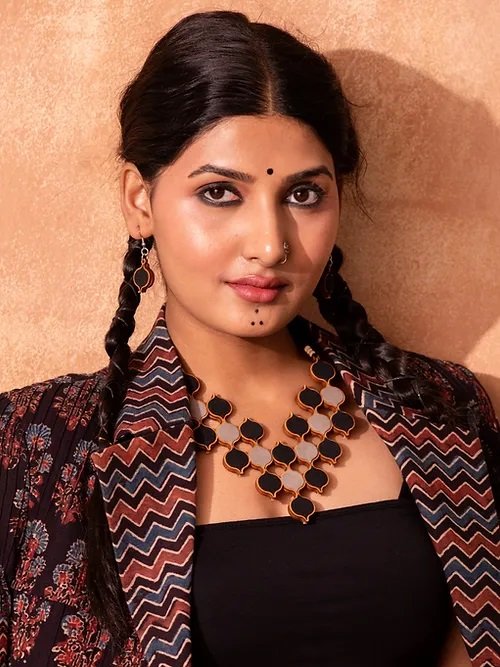 The fashion industry generates a huge amount of cutting waste. About 15% of fabric gets wasted during the cutting of the garment. In this collection, we've upcycled this waste into beautiful fabric, creating lovely jewelry pieces and contributing to a sustainable society.