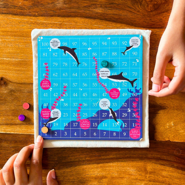 The game is a redesigned version of traditional Snakes & Ladders, where the sharks act like the snake while the corals like the ladder. The mindful touch of this aquatic saga is that the corals are associated with virtues- the good qualities and deeds that sway you up in life. While the sharks are associated with the vices -the bad qualities that sink you down. By gathering good virtues and doing good Karmas, one can attain Moksha (salvation) i.e reach their final destination. The game has a meaningful message while bringing a touch of nostalgia; as you indulge in board games again. It also brings the entire family together; thus bringing in togetherness, happiness and harmony. How to use: Choose your token and place it on 'START MINDFULLY’. Take turns to roll the dice. You can start your journey once you get a 6 on the dice. Roll the dice again and move the token up the numbers, as shown on the dice. Enroute, whenever you get a 6 on the dice, you roll it again and move up to the total of the numbers. If your token lands at the bottom of a coral, you swim up to the number on the top of the coral. If the token lands at the mouth of a shark, you take a dip to its tails end.