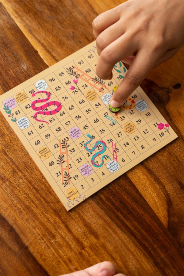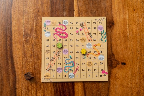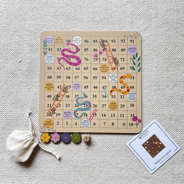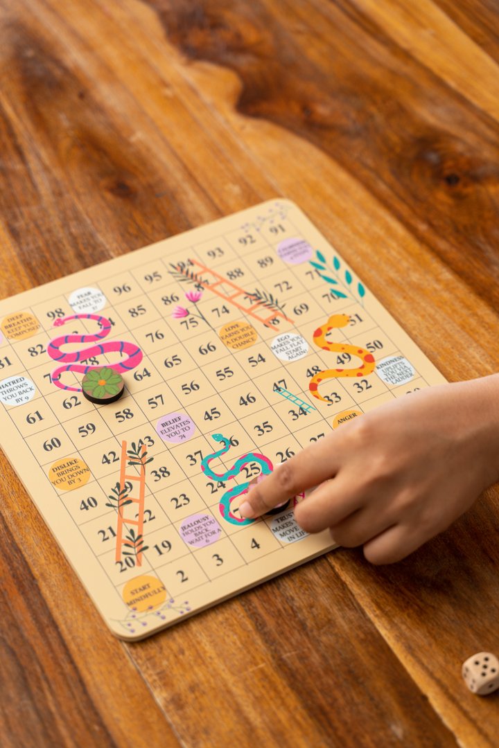 Snakes & Ladders – originally known as Moksha Patam, is an ancient board and dice game that originated in India. The game signifies the journey of life. The Virtues (represented by ladders) ? are the good qualities and deeds that take you up in life; while the Vices (represented by snakes) are the bad ones that bring you down. By gathering good virtues and doing good Karmas, one can attain Moksha (salvation). The game has been used in India for centuries to impart moral education to children; and to instill good virtues in them. The game here is based on the same concept; but with a slight twist. The ‘snakes’ and ‘ladders’ also appear in your life in accordance with your ‘feels’. Negative feels like anger, fear and jealousy bring you down; while the positive ones like love, trust and gratitude uplift you. The game has a meaningful message while bringing a touch of nostalgia; as you indulge in board games again. It also brings the entire family together; thus bringing in togetherness, happiness and harmony. Description:The game is based on the classic Snakes & Ladders, with different feels that represent the snakes and ladders. The tokens are made of wood and have a flower design inscribed on them. How to use: Choose your token and place it on ‘START MINDFULLY’ Take turns to roll the dice. You can start your journey once you get a 6 on the dice. Roll the dice again and move the token up the numbers, as shown on the dice En route, whenever you get a 6 on the dice, you roll it again and move up to the total of the numbers If your token lands at the bottom of a ladder, you move up to the number on the top of the ladder. If the token lands on the head of the snake, the snake bites you and you fall right down to its tail end.Likewise, when your token reaches a good feel like love, trust or kindness; you’re elevated. Reaching a negative feel like anger, fear or jealousy brings you down. Just keep on rolling the dice and follow mindful instructions all along The first person to reach ‘GRATITUDE’ is the winner. Gratitude is the noblest of human virtues and can make you achieve whatever you want with pure intentions.