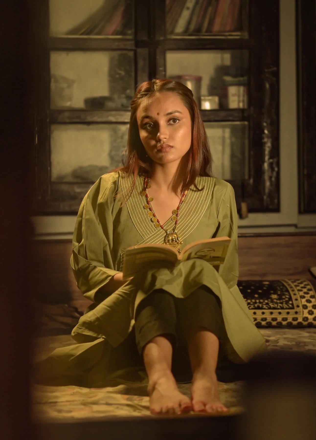 SURMAYI - Olive Green Kurta This olive green kurta features a V-neckline with decorative horizontal and diagonal stitched detailing that adds texture and visual interest to the upper part of the garment. The sleeves are long and have a relaxed fit. Color: Olive Green Fabric: 100% cotton Sleeve Length: Elbow CARE INSTRUCTIONS: DRY CLEAN ONLY
