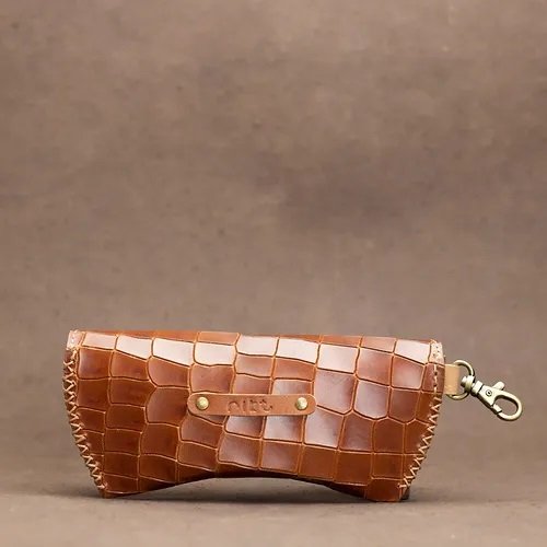 The tangy tan colored sunglass case is a stylish accessory designed to keep your sunglasses safe and secure. The case is made from high-quality genuine leather, which ensures durability and longevity. The mamba snake skin textured design adds a unique touch to the case's appearance and makes it stand out from other sunglass cases.