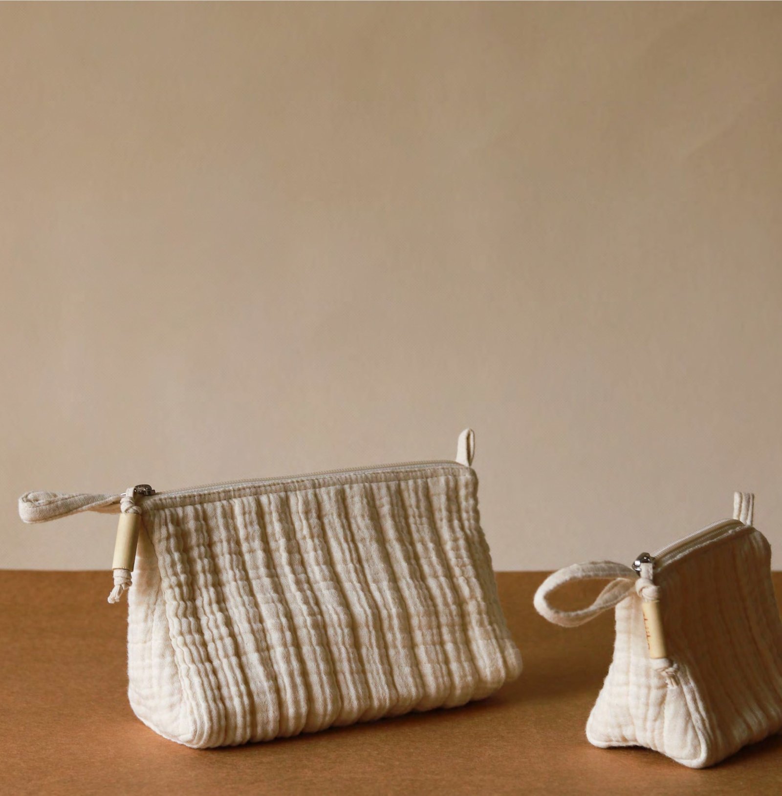 Triangle Pouch medium triangle pouch with wooden cylindrical pullers. available in original off-white & sand brown shades. Size:12 x10 x 8cm,12 x20 x 8cm Material/ Fabric: Cotton Colour:Off-white,SandBrown MRP:Rs.399